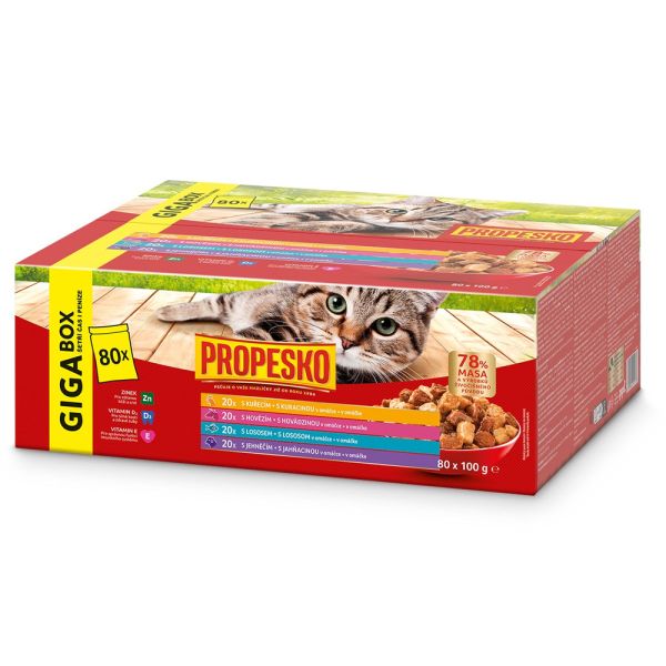 Propesko Cat Adult GIGA BOX Kapsička hovädzie/kura/losos/jahňa v omáčke 80 x 100 g