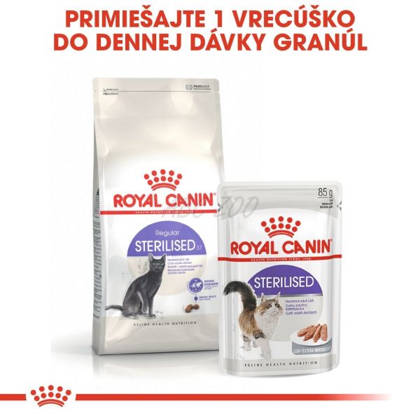 Krmivo ROYAL CANIN® Sterilized 37 taktiež obsahuje starostlivo premyslenú rovnováhu minerálov, ktoré pomáhajú udržiavať zdravý močový systém vašej mačky. A čo viac, ROYAL CANIN® Sterilized 37 je obohatený o L-karnitín – ktorý premieňa mastné kyseliny na energiu a má pozitívny vplyv na metabolizmus vašej mačky. Zatiaľ čo zvýšený obsah bielkovín v tomto krmive pomáha udržiavať zdravú svalovú hmotu vašej mačky. Aby bolo vyhovené individuálnym preferenciám každej mačky, je ROYAL CANIN® Sterilized 37 k dispozícii aj ako vlhké krmivo buď v lahodnej omáčke alebo šťavnatom želé. Pokiaľ uvažujete o kombinovanom kŕmení, jednoducho postupujte podľa kŕmnej tabuľky, aby ste zaistili, že vaša mačka dostane presné množstvo vlhkého aj suchého krmiva pre optimálny úžitok. V spoločnosti ROYAL CANIN® sme odhodlaní poskytovať nutričné ​​riešenie pre potreby vášho maznáčika. Všetky naše produkty prechádzajú rozsiahlym procesom kontroly kvality, aby bola zaručená optimálna kvalita krmiva a aby vyhovovali špecifickým diétnym požiadavkám a životnému štýlu vašej mačky. To znamená, že keď vaša mačka konzumuje ROYAL CANIN® Sterilized 37, dostáva kompletnú a vyváženú stravu.
