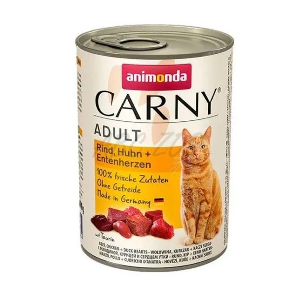 ANIMONDA CARNY ADULT mäsová konzerva pre dospelé mačky s hovädzím, kuracím mäsom a kačacími srdciami.