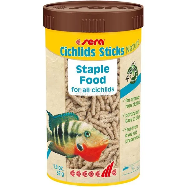sera Cichlids Sticks – špeciálne výdatné nefarbené krmivo pre cichlidy a ostatné druhy veľkých rýb.