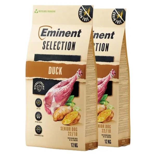 Eminent Selection Senior Duck je kompletné bezobilné krmivo s kačacím mäsom, pre staršie psy všetkých plemien.