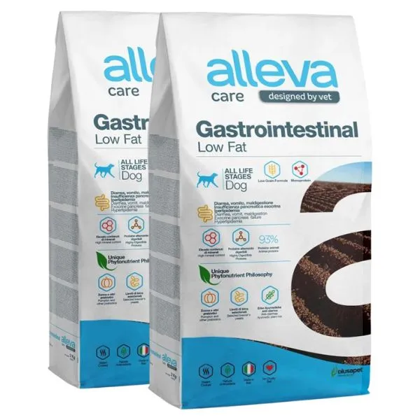 Alleva Care Gastrointestinal Low Fat je vysoko stráviteľné krmivo s nízkym obsahom tukov, zvýšeným obsahom sodíka a draslíka a vyberaným zdrojom rozpustnej vlákniny (psyllium, tekvica, XOS) a iných prebiotík. Receptúra je obohatená o komplex fytonutrientov z bylín, ktoré sú prospešné na zmiernenie hnačky a pre zdravie tráviaceho traktu a o komplex troch kmeňov vyberaných a vysoko čistených kvasiniek, schopných viazať patogény a podporiť imunitu v tráviacom trakte. Odporúča sa tiež ako podpora metabolizmu tukov v prípadoch hyperlipidémie.