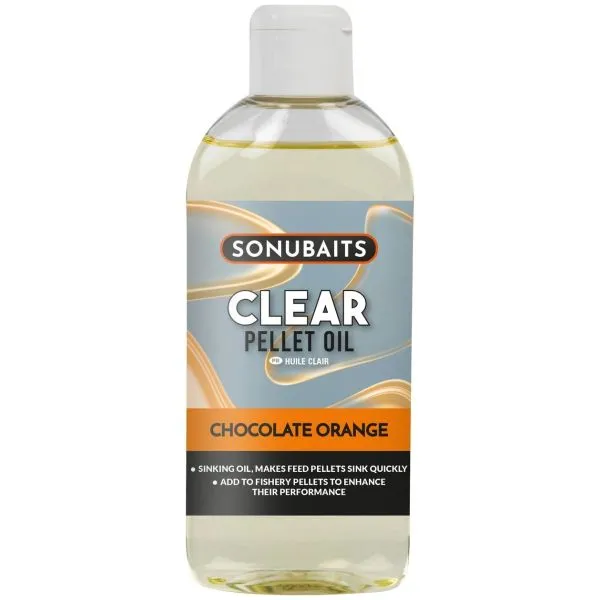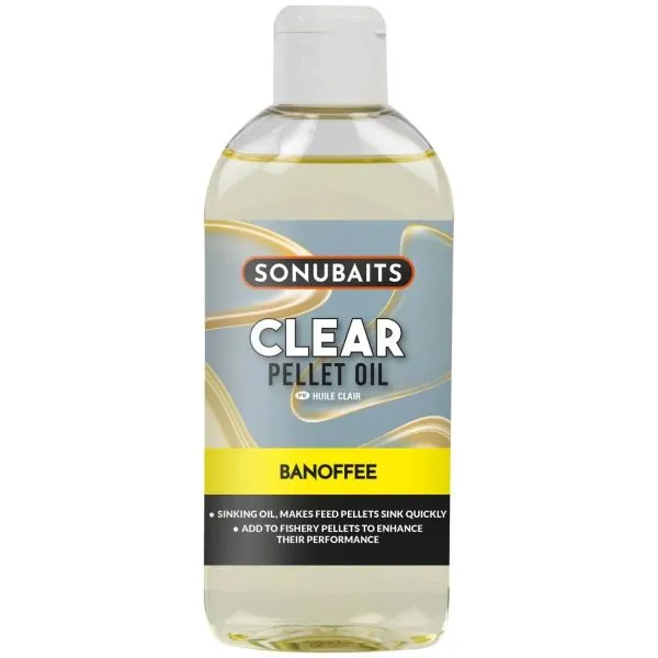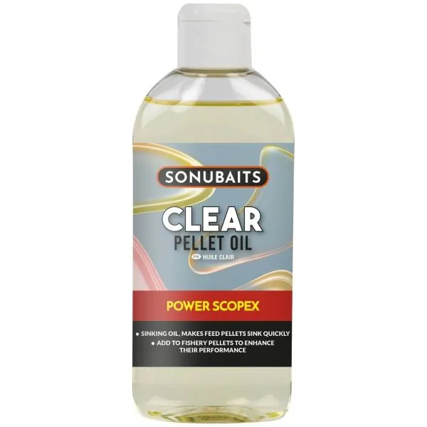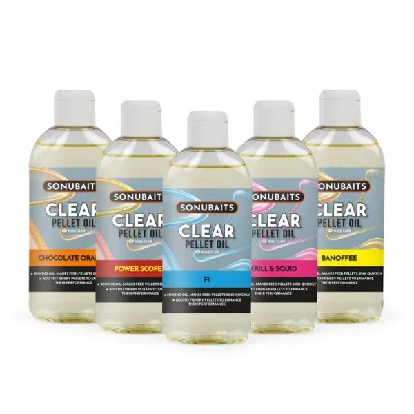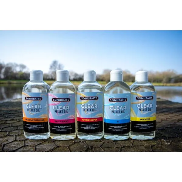 Na rozdiel od iných olejov má Clear Pellet Oil unikátnu vlastnosť – ide o ťažký, potápavý olej, ktorý je navrhnutý na vylepšenie vlastností bežných kŕmnych peliet, ktoré sa niekedy správajú nepredvídateľne. Je to neuveriteľne stabilný olej, ktorý si zachováva svoje vlastnosti v extrémne teplom počasí aj v mrazoch pod bodom mrazu. Rovnomerný nános tohto oleja zabezpečí, že každá peleta klesne priamo na dno rovnomernou rýchlosťou. Dodáva sa v praktickej fľaštičke s dávkovacím uzáverom.