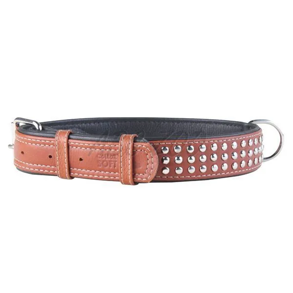 Ručne šitý, polstrovaný a elegantný obojok s kovou aplikáciou. Vyrobený z vysoko kvalitnej kože.
