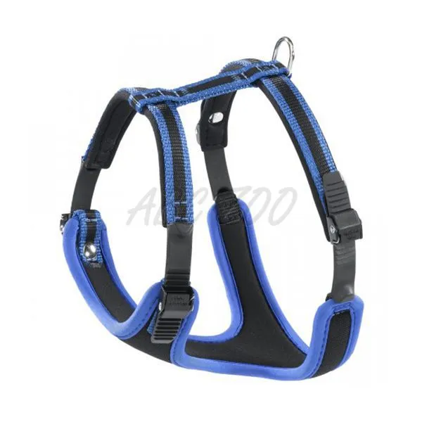 Prispôsobiteľný postroj pre psov modrej farby, s mäkkou výplňou na vnútornej strane a rýchloupínacím zapínaním. Viac detailov