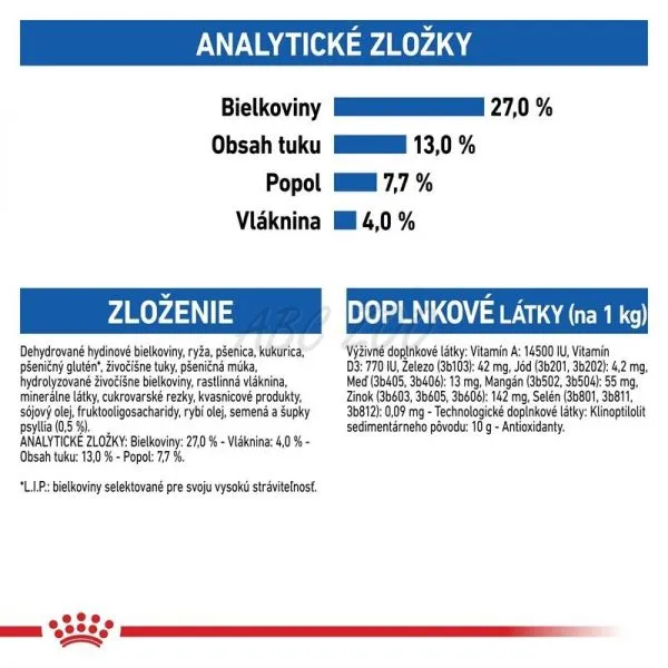 Analytické zložky: Proteín: 27,0% - Hrubá vláknina: 4,0% - Obsah tuku: 13,0% - Hrubý popol: 7,7%