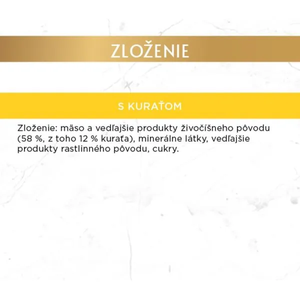 Výnimočnú chuť kuracej paštéty ocení aj tá najvyberavejšia šelma. Konzerva je určená pre dospelé mačky všetkých plemien.   Zloženie: mäso a vedľajšie produkty živočíšneho pôvodu (z toho 4% kuraciny), vedľajšie produkty rastlinného pôvodu, minerálne látky, cukry Analytické zložky: vlhkosť 77,5%, dusíkaté látky 10,5%, oleje a tuky 7%, popol 3,2%, vláknina 0,05%
