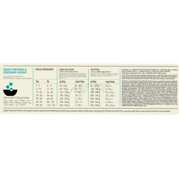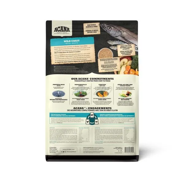 ACANA Wild Coast je plnohodnotné a biologicky vyvážené krmivo pre psy všetkých plemien a vekových kategórií s rybím mäsom (sleď, platýz, hejk-morská šťuka).