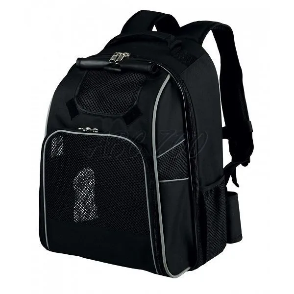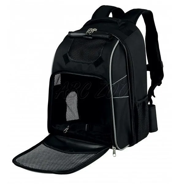 Pevný ruksak čiernej farby pre psov a mačky do 15 kg, vyrobený z polyesteru.