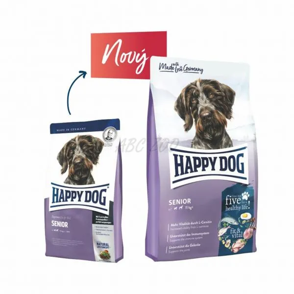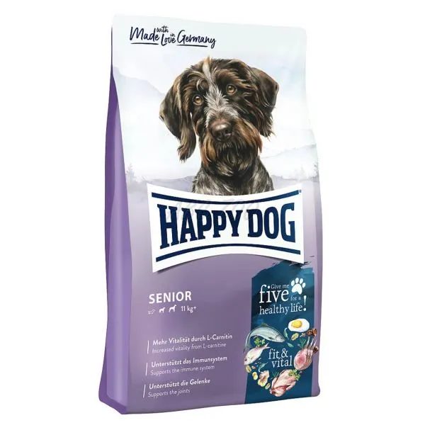 Happy Dog Fit & Vital Senior je kompletné krmivo pre staršie psy všetkých plemien dosahujúcich hmotnosť nad 11kg, s normálnou potrebou energie.