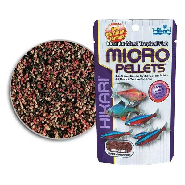 Hikari Micro Pellets je pestrofarebné krmivo vo forme malých peliet, určené pre Tetry, Parmičky a ďalšie tropické ryby s malým ústnym otvorom - 22 g.