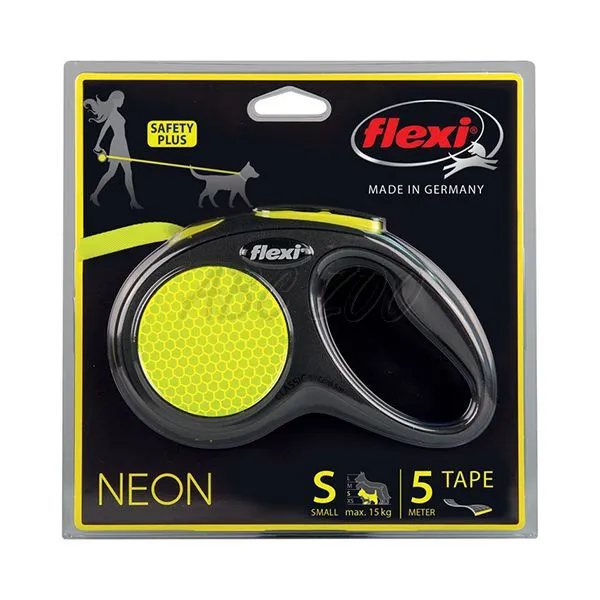 Flexi vodítko Neon S v neónovej žltej farbe s 5m popruhom, určené pre psov do 15kg.
