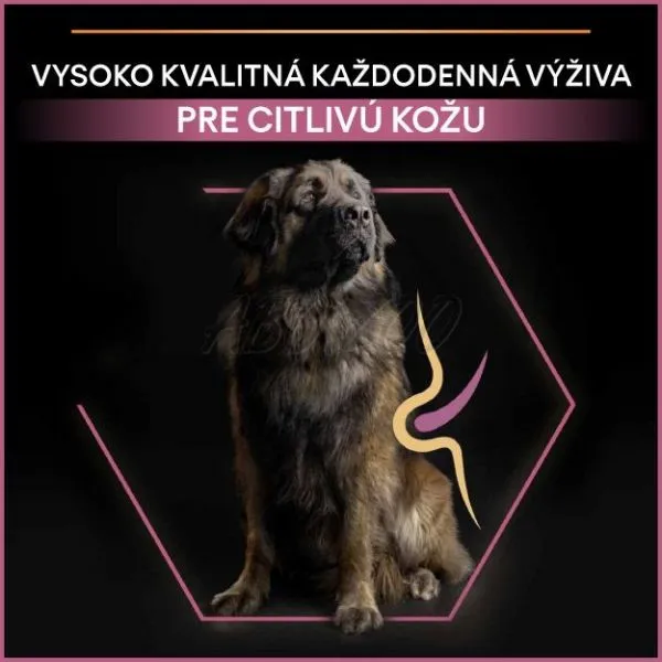 Hlavnou zložkou krmiva Purina PRO PLAN Sensitive Skin sú vysokokvalitného kúsky lososa. Granuly obsahujú vybrané zdroje bielkovín a sú bez obsahu pšenice, takže sú obzvlášť vhodné pre citlivých psov. Zvýšené množstvo omega-3 mastných kyselín s dlhým reťazcom (0,7 %) pomáha zvládať citlivú kožu. Vysoký obsah bielkovín pomáha udržiavať silné svaly a ideálnu telesnú kondíciu. Táto receptúra je vytvorená tak, aby aj citlivé psy dobre prosperovali.