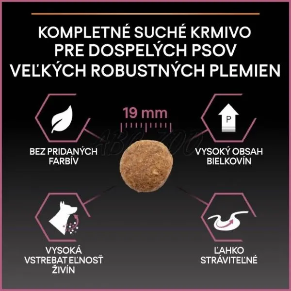 Purina PRO PLAN ADULT Large Robust je kompletné krmivo pre dospelých psov obrovských plemien s mohutnou (robustnou) stavbou tela a citlivou pokožkou.