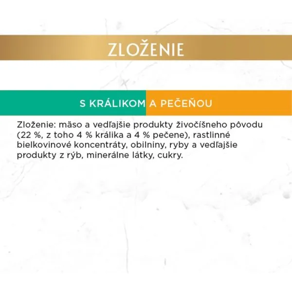 Zloženie: mäso a vedľajšie produkty živočíšneho pôvodu (z toho 4% králik a 4% pečeň), rastlinné bielkovinové koncentráty, obilniny, ryby a vedľajšie produkty z rýb, minerálne látky, cukry
