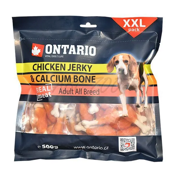 Pochúťka ONTARIO - Chicken Jerky and Calcium Bone je určená pre psov. Maškrta je v tvare kuracieho stehna s kalciovou kostičkou. Snack je 100%-ný prírodný produkt.