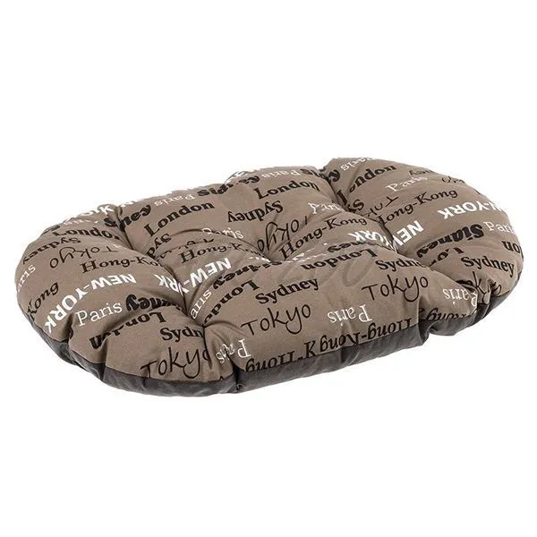 Pohodlný vankúš pre psov v hnedej farbe s potlačou názvov miest. Viac detailov