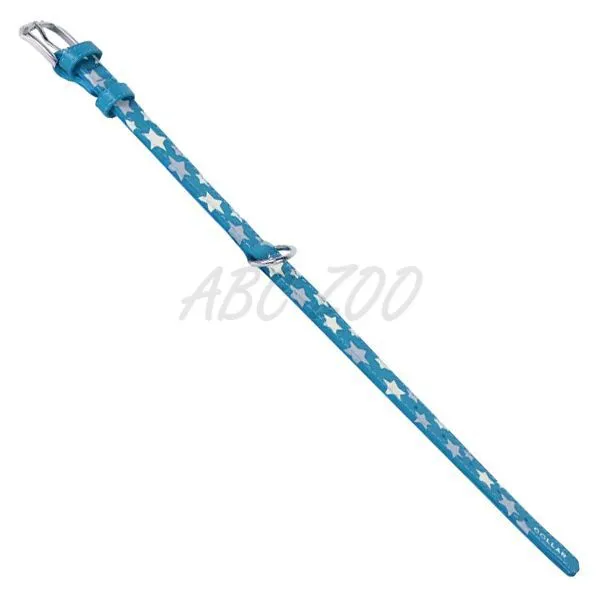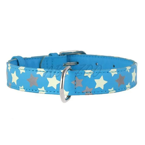 Modrý kožený obojok pre malé plemená psov s reflexnými a svietiacimi hviezdičkami, s dĺžkou 21 - 29cm a šírkou 12mm.