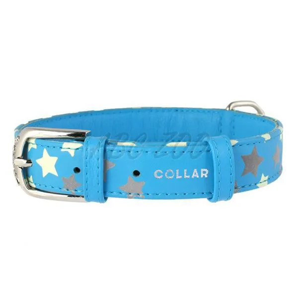 Kožený obojok modrej farby s reflexnými a fosforeskujúcimi prvkami z kolekcie CoLLaR GLAMOUR. Viac detailov
