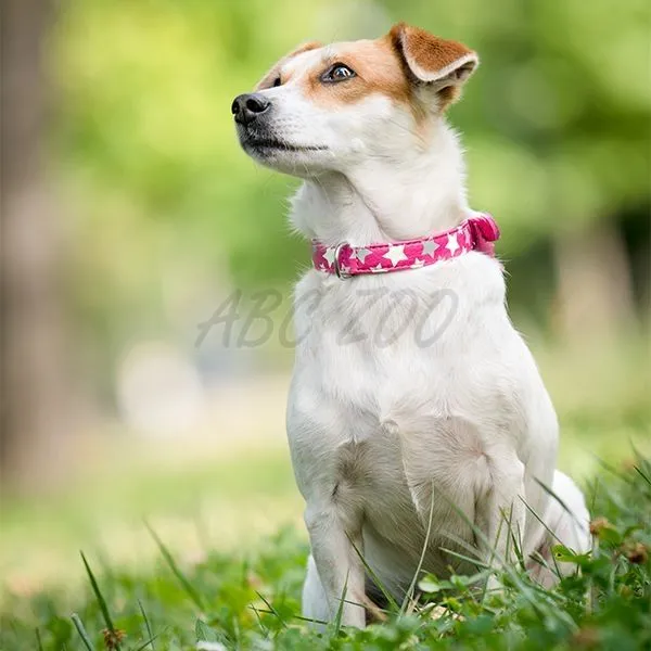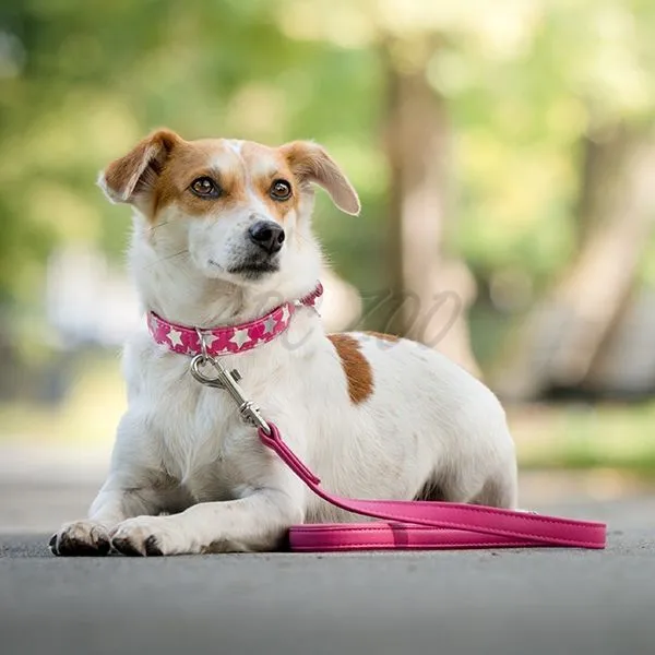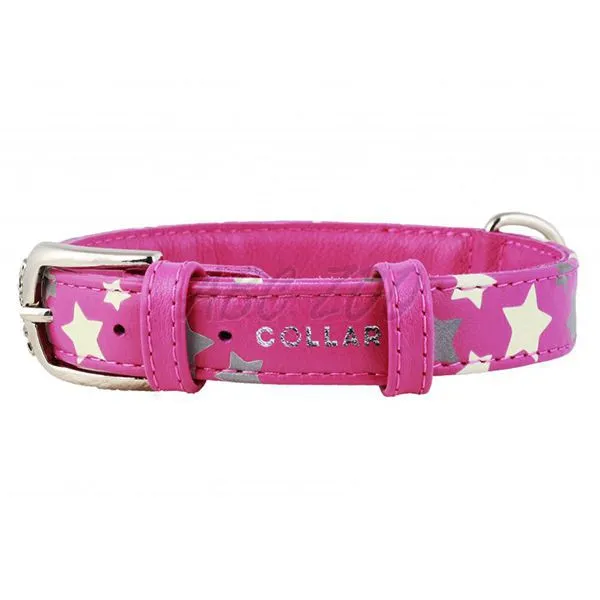 Ružový kožený obojok pre malé plemená psov s reflexnými a svietiacimi hviezdičkami, s dĺžkou 27 - 36cm a šírkou 15mm.