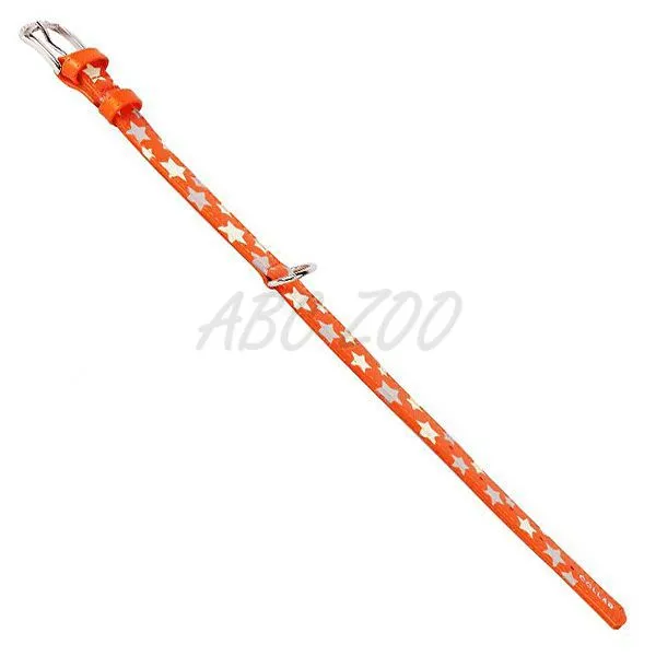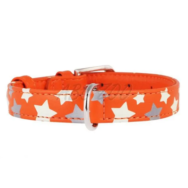 Oranžový kožený obojok pre malé plemená psov s reflexnými a svietiacimi hviezdičkami, s dĺžkou 27 - 36cm a šírkou 15mm.