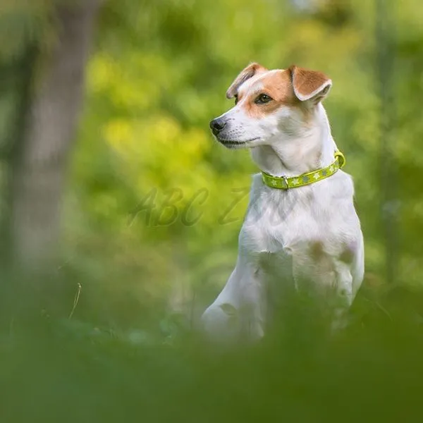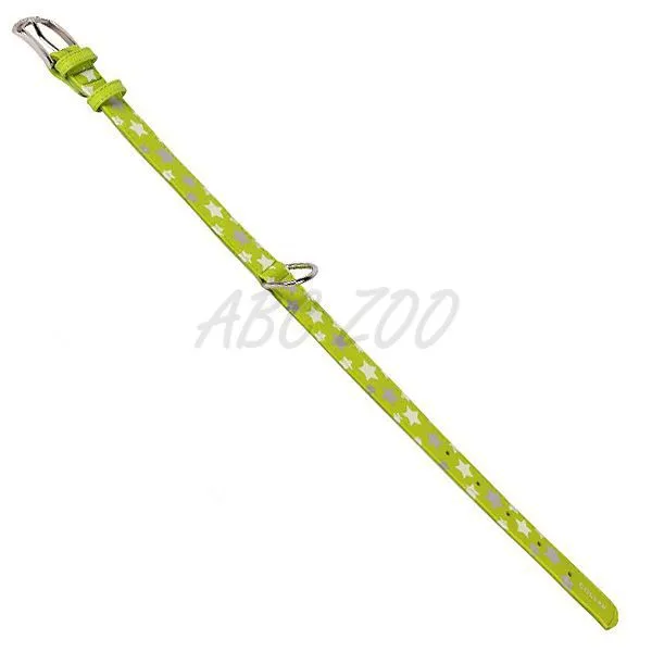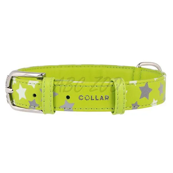 Zelený kožený obojok pre malé plemená psov s reflexnými a svietiacimi hviezdičkami, s dĺžkou 30 - 39cm a šírkou 20mm.