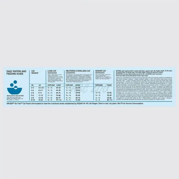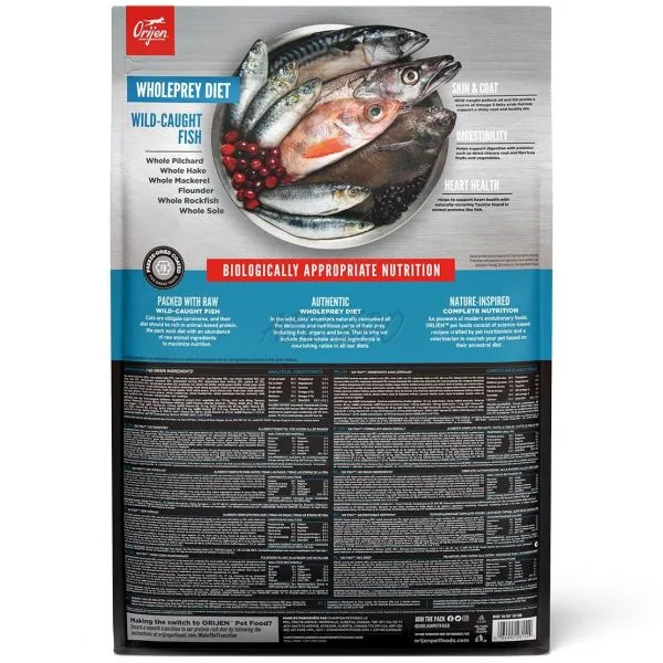 Zloženie: čerstvý vykostený losos (14%), celý čerstvý sleď (12%), dehydrovaný losos (12%), dehydrovaný sleď (12%), dehydrovaná treska (12%), celá čerstvá platesa (3%), čerstvý vykostený zubáč (3%), čerstvá vykostená severská šťuka (3%), čerstvý vykostený jazerný síh (3%), lososový olej (3%), olej so sleďa (3%), cícer, červená šošovica, zelená šošovica, zelený hrach, hrachová vláknina, repkový olej, lucerna sušená na slnku, sušená kelpa, tekvica, maslová tekvica, zelený špenát, mrkva, jablká, hrušky, brusnice, koreň čakanky, púpavový koreň, harmanček, lístky mäty, koreň zázvoru, semienka rasce, kurkuma, šípky, mrazom sušený sleď, mrazom sušená morská šťuka (hake), mrazom sušená platesa