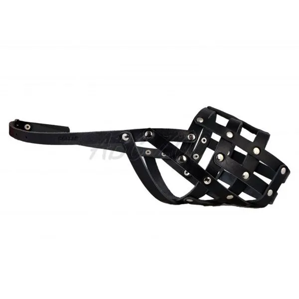 Nastaviteľný, kožený náhubok pre psa čiernej farby.