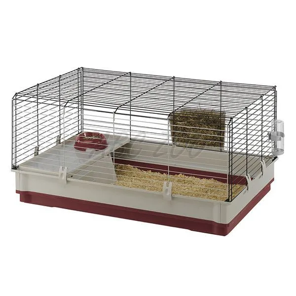 Klietka obsahuje: misku, senník, napájačku, plošinu, drevený domček