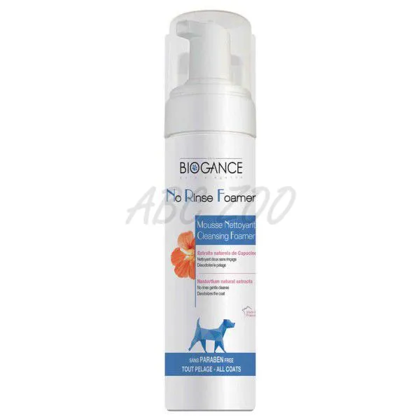 Francúzska kozmetika Biogance No Rinse Foamer vo forme peny obsahuje prírodný výťažok zo žeruchy. Čistí a odstraňuje zápach zo srsti, bez nutnosti opláchnutia.