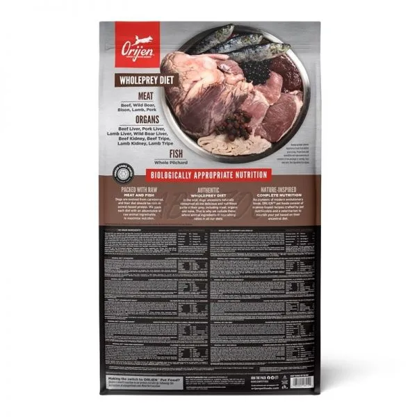 Psy ako mäsožravce sú prispôsobené strave, ktorá je založená na bohatom a rozmanitom obsahu celého čerstvého mäsa, s menším množstvom ovocia, bobuľovín a tráv. Krmivo Orijen ponúka všetky výhody surovej stravy, tak ako by ju Vášmu psovi ponúkla sama príroda. Je šetrne sušené mrazom pre uchovávanie prirodzenej chuti čerstvých miestnych surovín.
