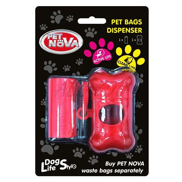 Červené plastové púzdro na vrecúška v tvare kosti s otvorom na jednoduché vyťahovanie sáčkov.