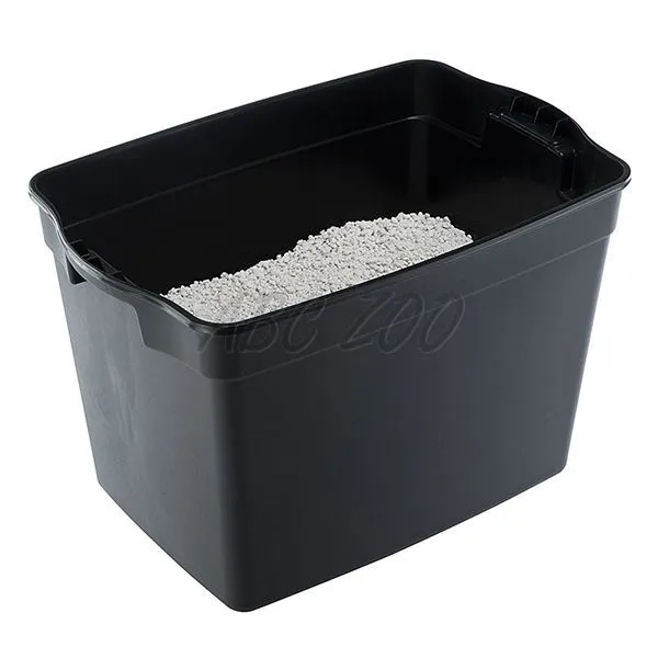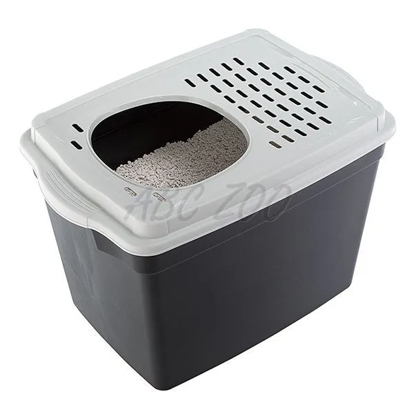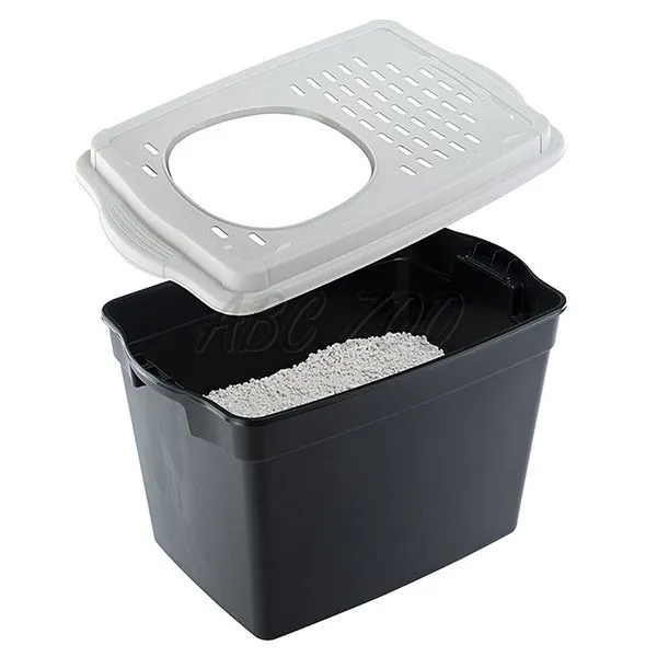 Plastová toaleta pre mačky so vstupným otvorom na vrchu toalety, čierno - sivá. Viac detailov