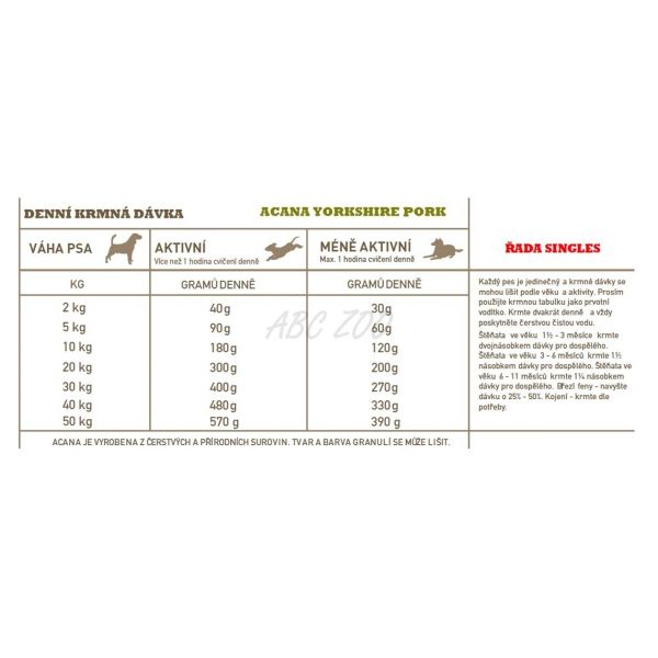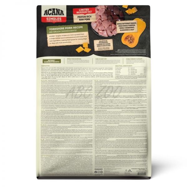 ACANA Yorkshire Pork je biologicky vhodné, monoproteínové krmivo pre citlivé psy všetkých plemien a veľkostí. Krmivo obsahuje 50% bravčového mäsa z prériových fariem a 50% ovocia, zeleniny a bylín.