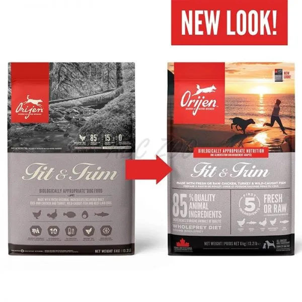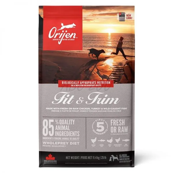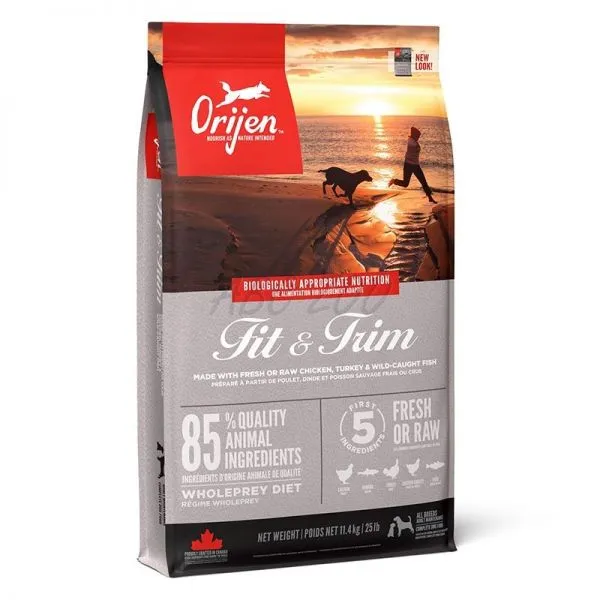 Receptúra Orijen Dog Fit & Trim má vysoký obsah mäsa z kuraťa, morky a morských rýb. Je ideálnou voľbou pre jedince trpiace nadváhou.