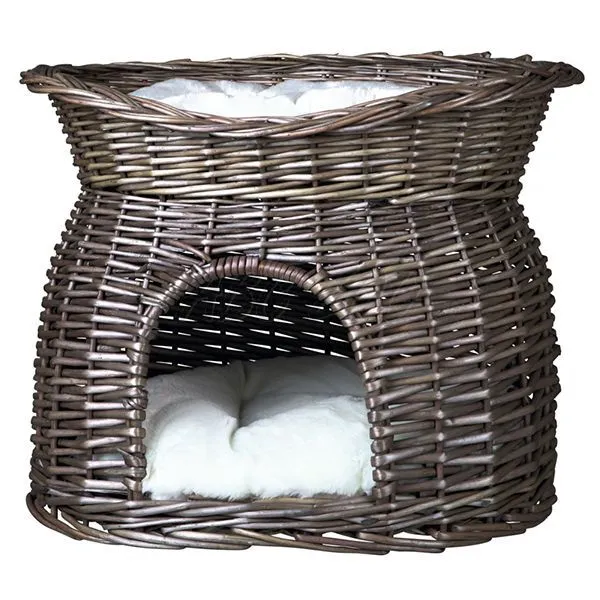 Prútený pelech pre mačky a psy s dvomi miestami na odpočinok v hnedosivej farbe.