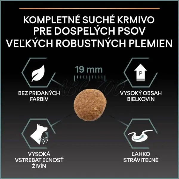 Purina PRO PLAN ADULT Large Robust je kompletné krmivo pre dospelých psov obrovských plemien s mohutnou (robustnou) stavbou tela a citlivým trávením, obohatené o jahňacinu.