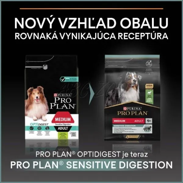 Purina PRO PLAN ADULT Medium Sensitive Digestion s jahňacinou, je kompletné krmivo určené pre dospelé psy stredných plemien a s citlivým trávením, vážiacich od 10 do 25 kg.