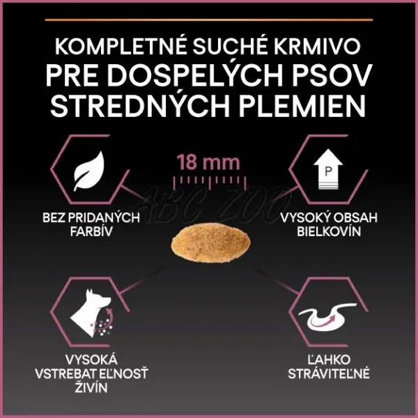 Purina PRO PLAN ADULT Medium Sensitive Skin je kompletné krmivo pre dospelých psov stredných plemien s citlivou pokožkou, vážiacich od 10 do 25 kg.
