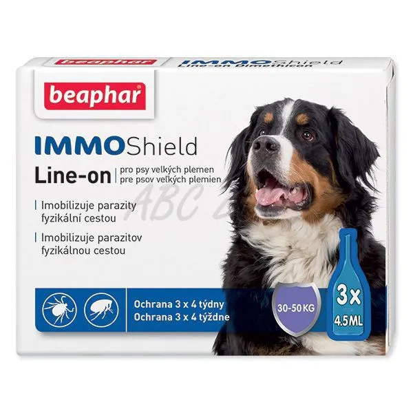 Pipety Beaphar IMMO Shield Line-on pro psy, je prípravok založený na látke zvanej dimetikon (silikónový olej), ktorý imobilizuje a tým likviduje blchy, kliešte a ostatný hmyz, predovšetkým komáre, roztoče a vši fyzikálnym spôsobom. Prípravok nie je vhodný pre gravidné a laktujúce suky!
