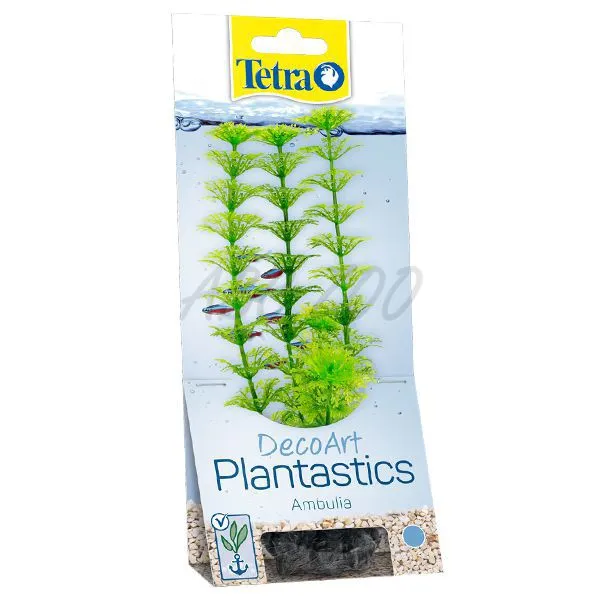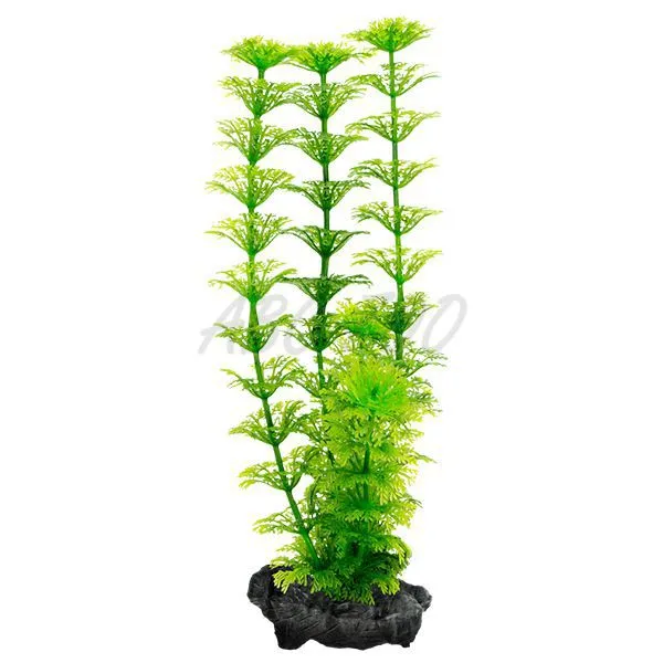 Akvarijná rastlinka Ambulia z plastu. Na vysokej stonke sú v hustých zväzkoch umiestnené drobné zelené lístky pripomínajúce ihličie.