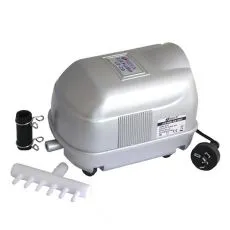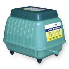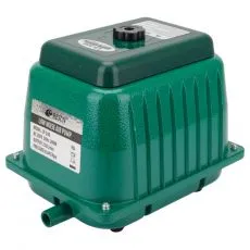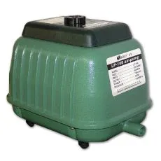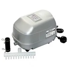 Externý vzduchovací kompresor s plastovým obalom a nízkou hlučnosťou pre akvária a rybníky.