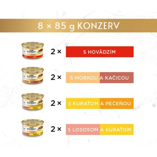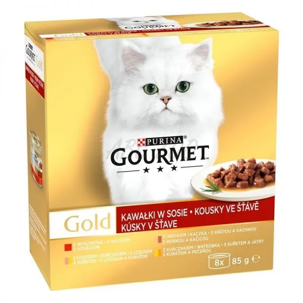 Gourmet Gold konzervy pre mačky hovädzie, morka a kačica, losos a kura, kura a pečeň v šťave 8x85 g