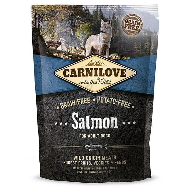 Holistické krmivo bez obilnín a zemiakov s vysoko kvalitným mäsom z lososa a sleďa, pre dospelé psy všetkých plemien.