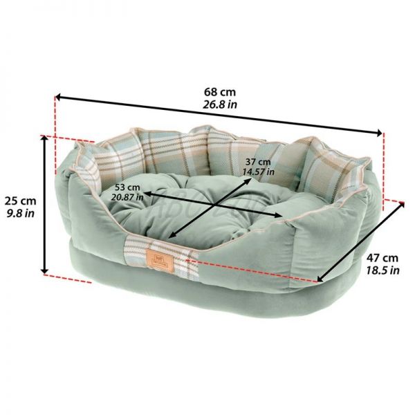 Pelech disponuje spevneným, no mäkkým vyvýšeným spodkom (cca 6 cm), ktorý výborne izoluje od chladnej podlahy. Vonkajšia strana je z mäkkého semišu, vnútro je z pevnejšej polyesterovej látky. Pelech zahŕňa vyberateľný obojstranný vankúš vo farbe pelechu.