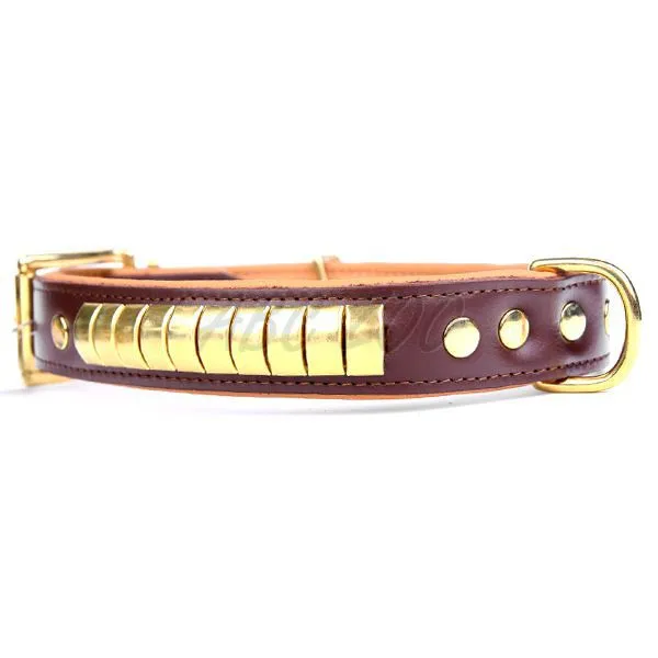 Obojok pre psy vyrobený z kvalitnej kože hnedo - béžovej farby s mosadznými doplnkami.