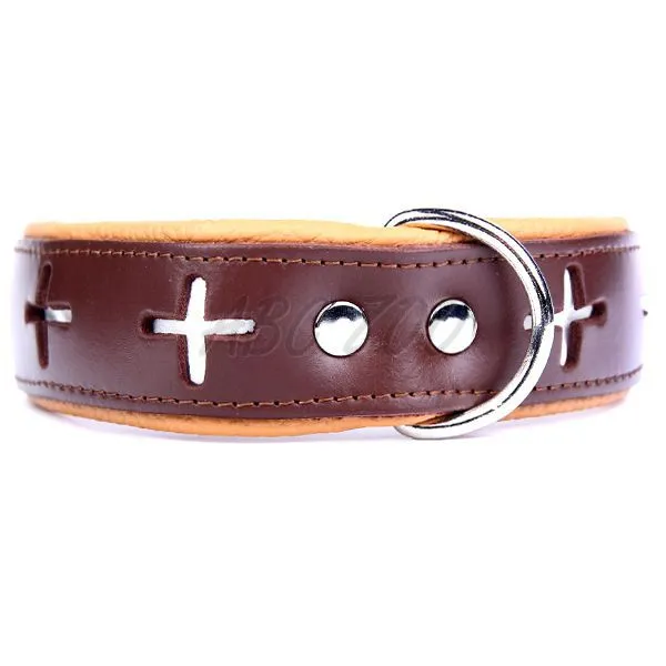 Obojok pre psy hnedo - béžovej farby vyrobený z kvalitnej kože s vyrezávanými krížmi na bielom podklade.