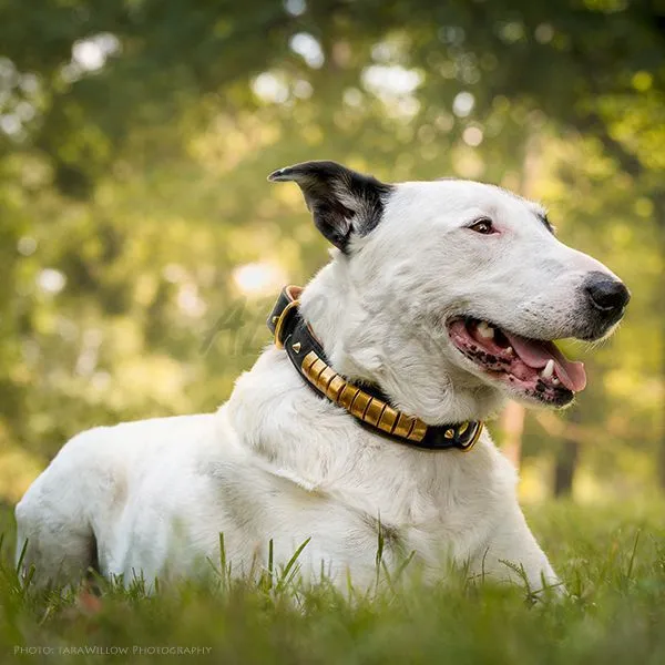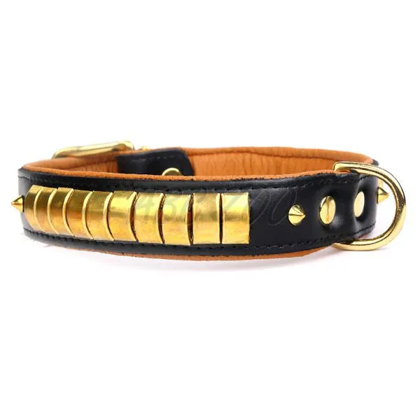 Obojok pre psy vyrobený z kvalitnej kože čierno - hnedej farby s mosadznými doplnkami.