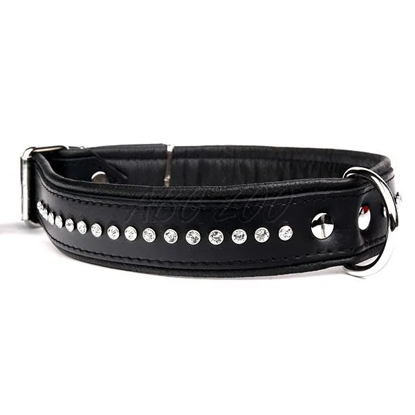 Obojok pre psy čiernej farby vyrobený z kvalitnej kože so striebornými kryštálmi.