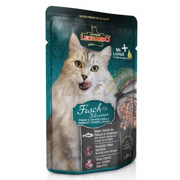 Kompletné, bezobilné krmivo pre dospelé mačky s rybami a krevetami.